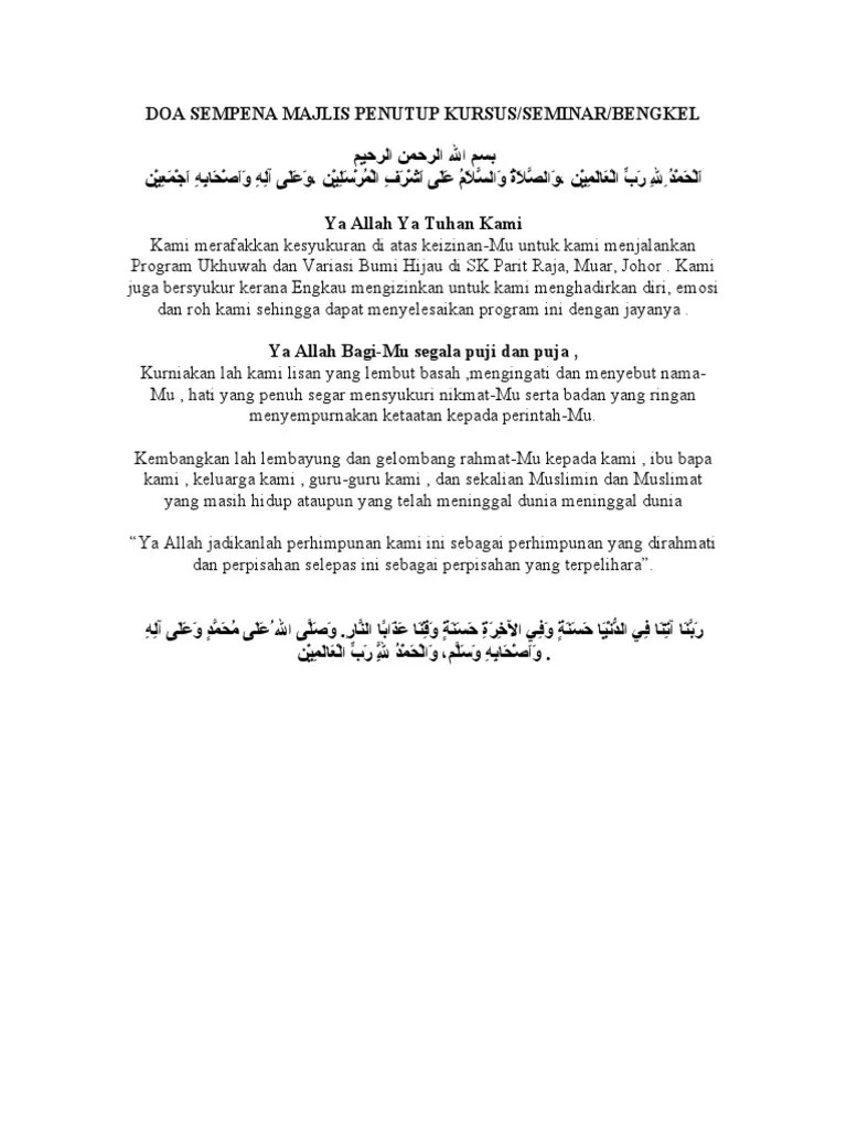 Doa sempena majlis penutup kursus. Doa sempena majlis penutup kursus/seminar/bengkel مِ ا سِْم بِ اهللِ ا انِ ا مَِن حِْم رَّ المِ ا يِْمحِ ا . Doa majlis penutup kursus بِسْمِ اللهِ الرَّحْمـنِ الرَّحِيْمِ ا اَلْحَمْدُ ِللهِ رَبِّ الْعَالَمِيْنَ وَالْعَاقِبَةُ لِلْمُتَّقِيْنَ وَلاَ . Tak lengkap rasanya, jika sesuatu . Allahumma antal azizul jalil, ya allah. Sesungguhnya pada pagi ini, kami ingin merafakan kesyukuran dan pujian .